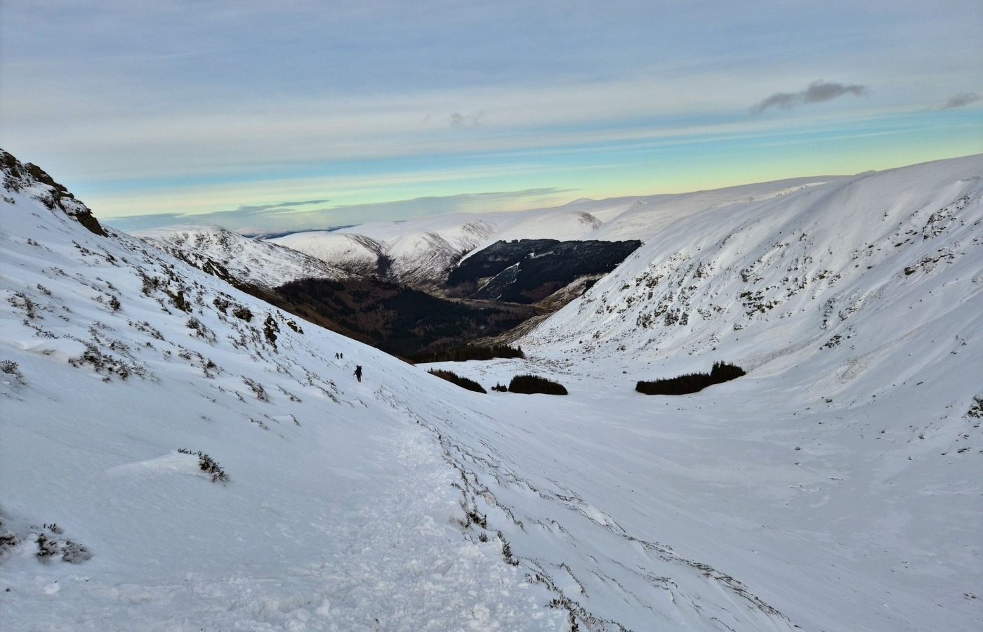 “Given the Kilbo Path dissects the steep corrie wall at angles of up to 60 degrees, a slip at any stage on the snow/ice slope would result in a person taking off into the Corrie 150+ metres below. In such winter conditions, the usual summer path is non-existent, covered completely in an unforgiving and uniformed blanket of snow and ice.