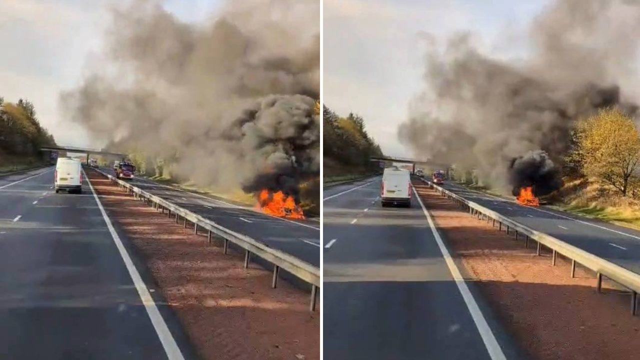 Images from the scene show a car engulfed in fire on the hard shoulder near Newhouse